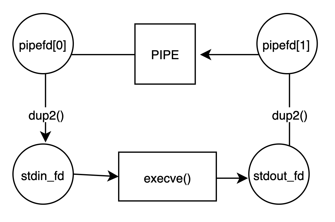 例として、execve()を使いPIPEから読み込み、PIPEに書き込むためには